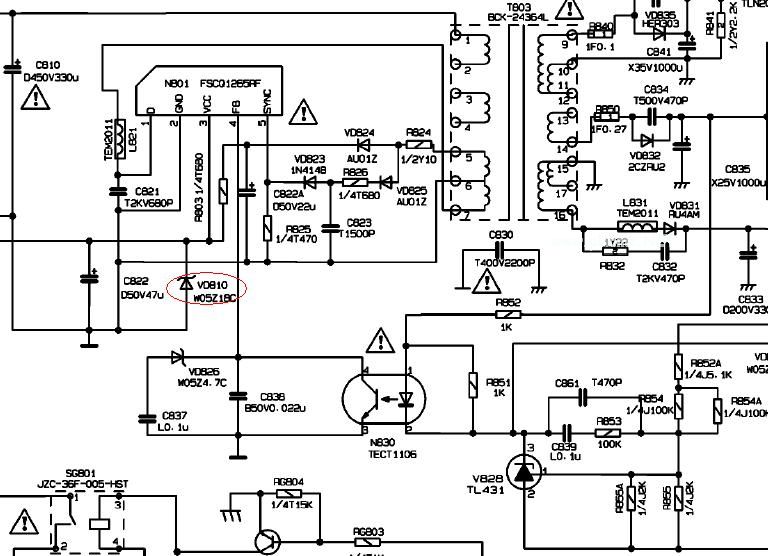 分析与检修:1,电源块N801(3)脚18V供电异常会出现电源无输出故障。(3)脚供电过程是,220V交流电经VD821,R821给C822充电当电压上升到15V左右时IC内部震荡电路启动,变压器初级绕组(5)(6)脚产生的互感脉冲经R824限流,VD824整流,C822A滤波,VD810稳压后给N801提供稳定的18V电压。2,(4)脚稳压控制输入异常也会使IC内部保护电路启动而停震。其工作过程为,+B140V经分压电阻852A,R854,R854A,R855,R855A分压后提供给V828(TL431)(1)脚,经内部比较放大后从(3)脚输出接入光耦(2)脚,通过光耦转换成控制电流加到N801(4)脚达到稳压的作用。3,N801内部电路损坏也会无输出电压。当电视出现故障时检测N801(3)脚电压只有3V检查外围电路代换VD810后电视故障排除。