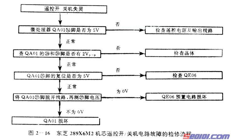 压不是 0V,是 QA01 损坏;若为 0V,还应在 QE06 预置电路寻找故障。 具体检修时,可按图 2—16 所示步骤与流程进行,
