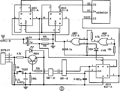 分析与检修 故障出现时,测M69032P的{23}脚低电平,{24}、{25}脚按00、01、10、11状态循环变化,说明序列测试控制电路正常,故障应在TEST触发电路。怀疑TEST开关不良,更换新的轻触开关,故障依旧。又怀疑TC4013不良,更换之,还是一样。细查TC4013外围电路(如图2所示),发现原理图中TEST开关旁的抗干扰电容为4.7μF,而实际使用的是0.027μF,是否厂家插错元件?试换4.7μF,发现TEST按键反应迟钝(当按下、放松之间的时间太短时,操作无效),不过故障出现的概率降低很多,但依然存在,说明元件是厂家进行的后期改动。在原理图上分析来分析去,均未发现异常,检修陷入了困境,无奈中怀疑排线不良,检查时不禁豁然明朗:TEST控制电平从STPB-11到STPA-11再经STPB-8到STPA-8,才到杜比解码板上的TC4013的③脚,中音经过两组排线和弯弯曲曲的铜箔线。传输距离远,受干扰的机会非常多,而抗干扰电容又远离TC4013的③脚CLK端,致使线路感应的干扰杂波很容易窜入触发器的控制端,引起误触发,自动进入序列噪声测试。在TC4013的③脚就近对地加装一0.027μF电容,开机进行长时间播放试验,均正常,故障排除。
