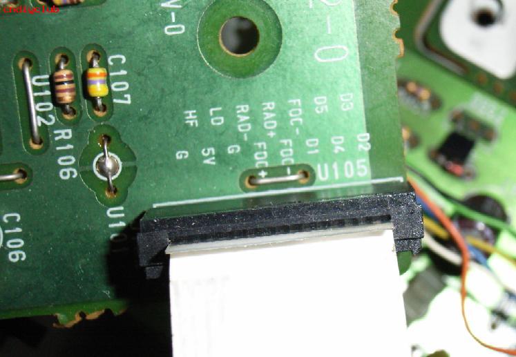 补焊后再次试机。这回碟子不再反转,但还是碟不出碟子。看来还得找原因,再用示波器测RF波形,还是不清晰,看来还得在HF-AMP小板上找原因了。用示波器测HF-AMP小板上的电源纹波,+5V正常。再测GND,它的纹波比+5V大了几倍多。因为示波器探头是接在主板上的。从结果上分析只能是HF-AMP小板上的地和主板主的地接触不良了。要么是排线,要么是接插件的问题了。于是将主板上的插座补焊一遍,将排线换掉。试机,读碟正常,RF波形清晰出现。