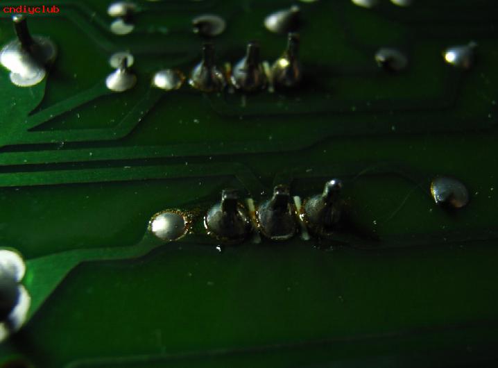 本着先易后难的原则,先检查电源,于是想用示波器去测电源的纹波。探头碰到7805的3脚时稍用一压。感觉有点异样,好像7805的3脚有松动的感觉。把主板翻过来一看。7805的引脚的确脱焊了,同时检查其他稳压块的引脚,也不同程度地存在脱。为是典型的热应力引起的脱焊现象。