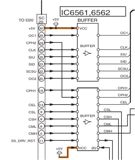 上图中最右边的插座是来自D板(逻辑板)的时序脉冲及5V电源,这两个IC的电源电压是5V。它们各自有两个使能端:1G、2G,当这两个使能端是低电平时,缓冲放大器正常工作,把输入端的信号放大后输出,当是高电平时,输出端没有信号输出。IC6561的1G、2G端子接地,因此IC6561通电后始终工作。IC6562的1G端子接地,2G端子受MAIN STOP信号控制。该信号来自D板,因此IC6562工作与否受D板控制。这两个IC各自内含8个通道缓冲器,这两个IC工作是否正常,判断方法很简单:在确保1G、2G端子是低电平的前提下,只要测输入端有波形,相应通道的输出端没有波形,则这个通道就坏了。根据实测,两具IC的输入端和输出端,都是5VP的方波,方波的顶部是5V,底部是0V。对于IC6561:除8、9、10、11、2、1、19为0V,20脚为5V外,其余各脚均有5VP-P的脉冲。对于IC6562:1、4、10、16、19为0V,20脚为5V,其余各脚均有5VP的脉冲,脉冲的顶部为5V,底部为0V。(本资料由北京松下等离子电视维修中心提供)