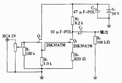 下面就制作过程中的几个关键问题做介绍。 (1)电源电路 由于PASS ZEN1放大器工作在单端甲类状态,双通道工作时,静态电流约为4 A,如采用单只变压器供电,变压器容量与次级线径均要较大,否则采用每声道独立供电是个不错的选择。本机采用1只500W 环牛为双声道供电;由于静态电流较大,整流桥的容量、品质一定要有保证,双声道供电应选用50A整流桥,否则压降过大,整流桥严重发热,甚至烧毁,应保证供电电压在34 V左右;同时由于电源电路负载较重,滤波电容一定要有足够的容量,否则可能引发交流声,如在不采用稳压供电情况下难以消除交流声,可采用简单的RC滤波形式,效果也很好,此时R应采用阻值在0.1 Ω 以下的电阻,并采用多阶滤波形式。 (2)放大电路调试 PASS ZEN1的静态工作电流由R1设定,适当加大R1可进一步降低功耗,但同时机器的最大输出功率也有所下降。在散热片面积偏小情况下,可利用上述方法折中,但一般不建议这样做。 在电路连接无误情况下,给机器加电,测量Q1的S,D脚间电压,并调整P1,使得S,D间电压为供电电压的一半。 (3)机器音色的调校 对本放大器音色影响较大的器件, 主要是IRFP140及输出电容C3,C4,电容应尽量选取音频专用电容器,同时也可使用1支6800 uF并联1支1 uF CBB电容代替C3,C4。 (4)机器的散热与功率管的固定 由于甲类机器发热量很大,应采用大型外置散热器或强制风冷。功率管可直接固定在散热片上,由于散热片温度很高,电路板应距离散热片稍远,通过导线联接功率管。 PASS ZEN1是一部增益较小的纯后级,需连接前级放大器才可驳接CD等播放器。若无前级,可利用节型场效应管2SK30自制一部前级。由于2SK30属于耗尽型场效应管,偏置电路变得简单,考虑到利用PASS ZEN1的电源。实际使用的前级放大器原理图如图2。