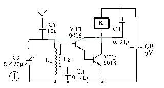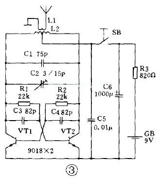 L2用Φ1漆包线在Φ15的圆木棒上间绕5匝,然后脱胎,将其拉长到10mm,在中心引线作为抽头。线圈两头直接焊在瓷介微调C1的两焊片上固定。L1为高频扼流线圈,可用Φ0.1漆包线在阻值1MΩ以上、1/8W电阻上乱绕30匝,GB用3节7号电池,SB为微动开关。由于本电路工作在脉冲状态,3节电池可使用半年以上。
