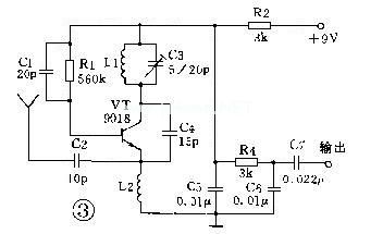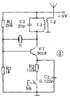 图2是基极接地的电容三点式振荡器,用它作为无线电遥控发射器,电路工作稳定,振荡频率可以做得较高,但电路输出功率略小,L2与L3为高频扼流线圈,可用Φ0.1漆包线在阻值1MΩ以上电阻上乱绕50匝,然后将两线头焊在电阻两引脚上即可,设置高频扼流线圈的目的可有效减小人手按动开关SB时所造成的人体感应现象,该电路也为无调制式。