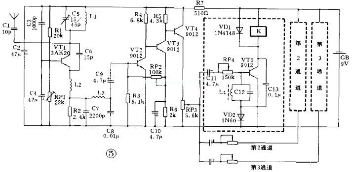 图5是与无线电遥控发射器图6配套的多通道无线电遥控接收器。VT1构成超再生检波器,VT2~VT4组成音频放大器,VT5则构成选频放大器,有多少个通道就要有多少个选频放大器,图中只画了一个,其他按虚线框依次添加即可。现主要介绍选频放大器的工作过程:L4与C12组成选频回路,其谐振频率应与发射器调制的音频频率相一致,当输入陔放大器的解调音频信号等于其选频频率时,该同路呈现最大阻抗,此信号顺利送至VT5基极进行放大,并由集电极输出又经电容C13反馈到接在基极回路里的二极管VD2上进行来复检波,其正半周经VD2入地,负半周使VT5基极电流加强,从而使集电极电流加大,最终使继电器K吸合。选好每个通道里选频回路的电感、电容值,当按下发射器任一通道发射按钮时,就能使对应通道里的选频放大器导通,使继电器吸合。