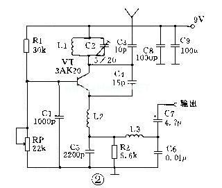 图2是一个典型的超再生接收电路,C4构成正反馈使电路处于强烈再生状态,淬灭频率由高频扼流圈L2及R2、C5决定,其取值大小对接收灵敏度影响极大,L1、C2决定的接收频率必须与发射器一致。超再生检波器解调后的音频调制信号经低通滤波器L3、C6由C7输出。低通滤波器滤除超再生检波器所特有的超噪声。高频扼流线圈L2、L3制作同发射器。