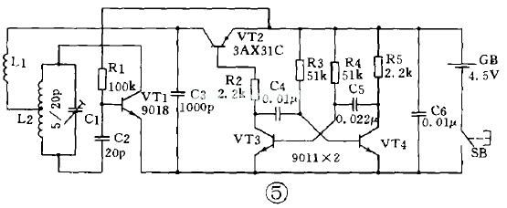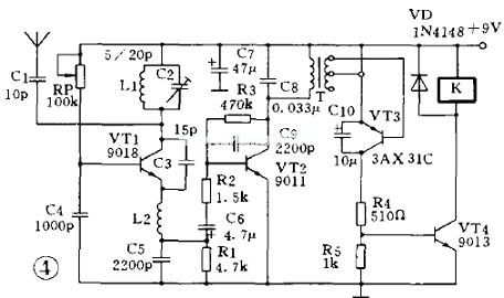 图4所示电路是与无线电遥控发射器中图5配套的接收器,VT1构成超再生检波器,当按下发射器发射按钮时,它就接收到来自发射器的电信号,解调后的音频信号由C6输出送至VT2放大后,经T送至VT3的发射结,VT3偏压直接来自T次级线圈的音频信号,该信号经VT3发射结整流后达到0.25V左右,使锗三极管VT3获得正偏置而导通,集电极电流在R5上的电压降作为VT4的基极偏压,VT4也导通,继电器K得电吸合。松开发射器按钮,电路回复到静态,K失电释放。由上面分析可知,只有按下发射按钮,K才吸合,松开发射按钮,K即释放。