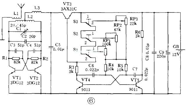 VT1、VT2组成推挽式高频振荡器,振荡频率由L2、C1与C2决定,L3为高频扼流线圈。VT3为调制管以完成对高频振荡器的开关式幅度调制,其工作过程与前者相同,VT4与VT5组成自激多谐音频振荡器,其振荡频率由C6、C7、R4、R5及RP1~RP3决定。
