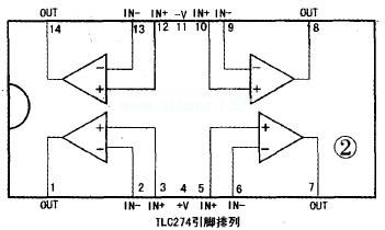 从电路结构看,麦克风MIC通过导线连接输入端与地线之间。并通过R1接到电源正极,信号交流成分通过电容C1耦合到运放IC1c同相引脚。麦克风灵敏度的调节在很大程度上取决于R1值大小。建议R1值取15kΩ,对于所用麦克风品牌型号不同,R1值也应作相应改变,以便达到所期望的灵敏度。在最大灵敏度调节时,在房门打开,空气气流对麦克风振动膜的压力作用下,就应该使LED受到触发而点亮。IC1采用TLC274,其引脚图见图2。