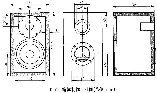 选好单元和设定分频器后,就可以设计箱体了。考虑到要有一定的低频能量,本箱按倒相箱设计。在这里,箱体的尺寸和倒相孔开口尺寸是基于单元的Thiele/Small参数设计的,最后要考虑到单元、吸音材料的体积的加入,应增加10%的余量,同时也考虑到分频器元件电阻对喇叭Q值的影响。因此,箱体的内容积还是设计得大一点留有调整余地为好。