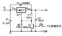原理图见图6。当外来的TTL控制信号使V1截止时,输出电压为5V。同样,改变R2使的值可获得不同的电压输出。V1可用9013等NPN管替换。