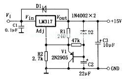 V1和V2的作用是:当输出短路时,C2上的电压被V2泄放掉,从而达到反偏保护的目的。此外,当输入短路时,C3等元件上储存的电压会通过V1泄放,用于防止内部调整管反偏。C2用以提高IC的纹波抑制能力。C3用以改善IC的瞬态响应。C1用于输入整流滤波。在大电流输出时,IC会因温升过高而截止,必须加适当面积的散热器。R2应选用线性的电位器。