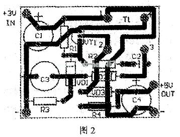 印刷电路板见图2,尺寸为30mm x 38mm。安装完成后,接上电源,空载时其输出电压约为5.8V,电路工作电流为60mA,当工作电流偏大时可适当增加R1的阻值.待充电插头插上手机后,电压约降为5V。这时电路工作电流约为210mA,充电电流约为120mA。当充电电流偏小时可适当减小R2的阻值。