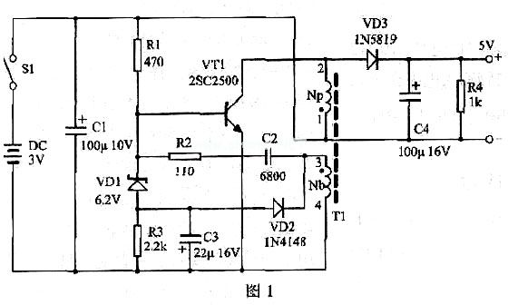 需要说明的是:由于输入直流电压低,不需要隔离,同时输入直流电压干和输出直流电压比较接近,因此高频变压器没有设次级线圈,负载电路的能量直接从初级线圈获取。这样做有两点好处:一是提高了电路的转换效率,二是VD3、C4、R4等同时又组成了浪涌电压吸收回路,吸收VT1截止瞬间产生的反向高压。