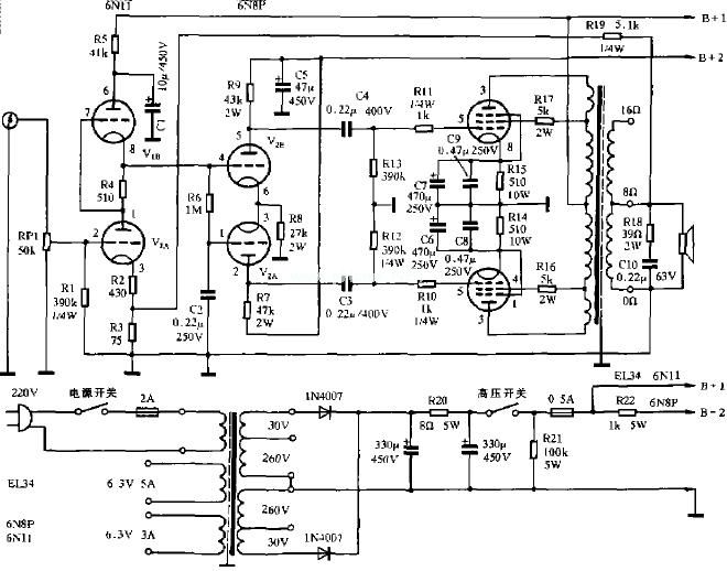 电源由电源变压器屏极高压、栅负偏压、灯丝电压组成。该机电源变压器采用250W、C型铁芯。初级0-240V-220V两组;次级260V+30V两组,经1N4007电源整流二极管全波整流后,可提供B+直流高压380V,EL34灯丝电压6.3V、5A两组,6N11、6N8灯丝电压6.3V 3A一组。
