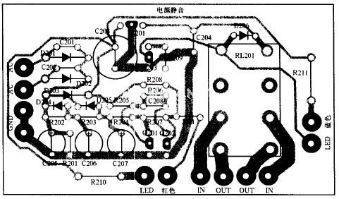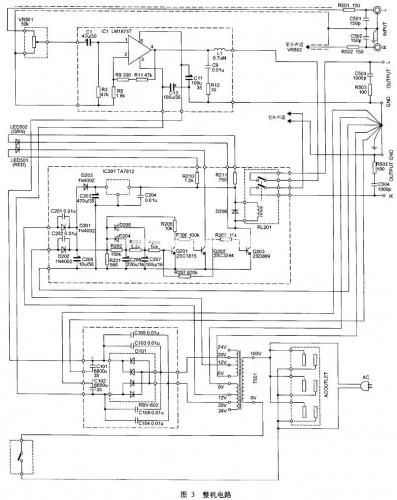 经过约5秒钟后,Q201基极电位因电容不断充电而上升到一定程度后开始导通,引起Q202截止,因其集电极电位升高而使Q203导通,继电器RL201吸合,LM1875输出信号即加到扬声器输出端子上,使外接扬声器放音。同时串于Q203集电极供电电路中的绿发光二极管LED502发光,而红发光二极管LED501熄灭,表示整机进入正常状态。LM1875的最大输出电流可达3A,因此应该选择具有相应触点电流容量的继