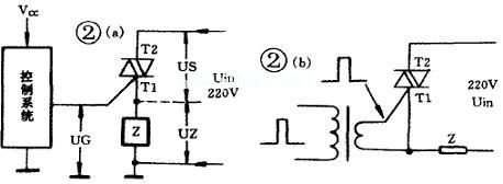 触发电路设计不当的第二个例子常见于电子制作稿中,其电路见图2, 图中对电路进行简化。其实, 无论控制系统完成何种控制,无论是单向还是双向可控硅, 图2的触发电路是不能正常工作的。其问题在于,控制系统发出触发信号UG,其参考点是共地,而可控硅T1或T2的参考点是负载热端。实际上, 加到可控硅的触发电压UG是与负载端电压UZ相串联的。双向可控硅究竟是T1还是T2为触发参考点,视触发信号的相对极性来决定的。如按图2中标注,T1在下,T2在上, 则UG相对于T1必须是正极性的, 且与T1的电压同参考电位。但无论T1还是T2作参考点, 按图2的接法,可控硅导通时,UZ常近似等于Uin,如此高电压加到触发极G和T1之间, 将立即使触发极被击穿,可控硅被损坏。
