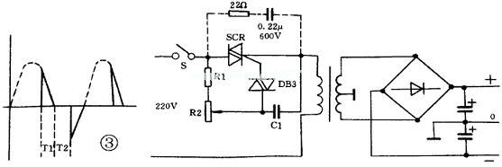 图3是某电子杂志刊出的无级直流输出调压电路。原作者称,利用Rc移相网路控制SCR的导通角改变变压器初级的电流,从而获得两路连续可调的2x(0—17V) 的直流输出电压,负载电流为800mA 。很明显,推荐电路(图3)是普通移相式调功电路和降压变压器整流滤波电路的串联, 从基本原理分析,似乎无大的原则问题。变压器初级每半周电流有效值随可控硅导通角变化,次级输出电压的峰值、平均电流值都随之而变。当然,一定负载时输出整流电压也必然改变。本人看后,极感兴趣,依此原理制作了一台输出100±40V范围变化的维修代用直流电源,并依照图中虚线加入RC吸收回路。实验时,该电路一接入电源,距此10米远的电视机屏幕上即出现两条缓慢移动的黑带(从邻居的责问中得知),同时,空载下不到十分钟,SCR即击穿。更不能容忍的是,降压变压器铁心发出拖拉机启动时的声音,室内电度表也发出同样的声音,而且,随着输出电压的调低,声音更大。