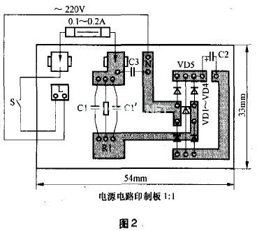 图1中限流“降压”电容C1仅与交流电源起能量交换作用,只存在一定无功损耗,本身并不消耗有功功率,显然有利节电(相对电阻降压而言)。由此而省去了一个体积较大的电源变压器,既节约了制作成本又缩小了灯具的体积。负载使用超高亮、低功耗LED新光源,这两者有机结合是提高灯具能效的较佳途径(该灯功耗约3.2W左右而实际亮度可与老式8W日光台灯媲美)。