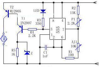 如下图所示,NE555作为振荡器使用,其输出(脚3)的脉冲频率可在5-12Hz范围内调节。调节范围决定于R1和C1的值。由晶体管T1和T2构成功率输出级控制电机。AJ1和P1可控制555的振荡频率。有“调速”和“变速”两种模式可供选择。“调速”模式是将P1调定于某一频率,让马达按确定的速度旋转。“变速”模式则是用自动控制手段不断调节P1,使马达随时改变转速。
