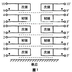 4、初级和次级线圈应按同一方向的顺序绕制,初级线圈被夹在两组次级线圈之间,并注意同名端(见"·"符号),如图1所示。每绕完一组,应注明编号或作好记录。