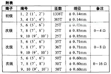 5、次级绕组有三种情况:(即0-4-8-16Ω),应根据所配接的扬声器阻抗来确定圈数和线径,有关数据见附表。