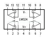 每一组运算放大器可用图1所示的符号来表示,它有5个引出脚,其中“+”、“-”为两个信号输入端,“V+”、“V-”为正、负电源端,“Vo”为输出端。两个信号输入端中,Vi-(-)为反相输入端,表示运放输出端Vo的信号与该输入端的相位相反;Vi+(+)为同相输入端,表示运放输出端Vo的信号与该输入端的相位相同。lm324引脚图见图2。