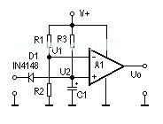 如果将二极管D1去掉,则此电路具有加电延时功能。刚加电时,U1>U2,运放A1输出低电平,随着电容C1不断充电,U2不断升高,当U2>U1时,A1输出才变为高电平。参考图2。