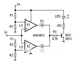 附图中使用两个运放组成一个电压上下限比较器,电阻R1、R1ˊ组成分压电路,为运放A1设定比较电平U1;电阻R2、R2ˊ组成分压电路,为运放A2设定比较电平U2。输入电压U1同时加到A1的正输入端和A2的负输入端之间,当Ui >U1时,运放A1输出高电平;当Ui <U2时,运放A2输出高电平。运放A1、A2只要有一个输出高电平,晶体管BG1就会导通,发光二极管LED就会点亮。