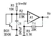 见附图。感温探头采用一只硅三极管3DG6,把它接成二极管形式。硅晶体管发射结电压的温度系数约为-2.5mV/℃,即温度每上升1度,发射结电压变会下降2.5mV。运放A1连接成同相直流放大形式,温度越高,晶体管BG1压降越小,运放A1同相输入端的电压就越低,输出端的电压也越低。