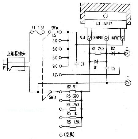 电路见图,12V电源从车载点烟器插孔取出,经二刀六位波段开关之一SW1A送入可调三端稳压器LM317的输入脚,LM317的调整脚(ADJ)经SW1B接入不同阻值的电阻到电源负端。当SW1在不同档位时,就可在输出端获得1.5V、3.0V、5.0V、6.0V、9.0V、12V几种电压,供相应的低压电器使用。LM317应安装在铝散热器(100×100×25mm)上,主要是因为在1.5V档时发热量较大。整个电路装入适当的小盒中,面板上只设波段开关即可。