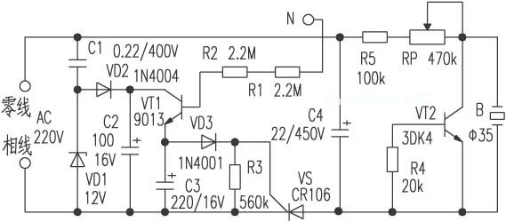 VD1使用12V左右的稳压二极管,VT1可用普通9013型等硅NPN三极管,VT2最好用3DK4型等硅开关三极管。VS要采用触发电流较小的单向可控硅,如2N6565、CR106型等。C1要求采用耐压400V以上的CBB型聚苯电容器,C4要求使用耐压450V的电解电容器。触摸电极片N与电路相连采用两只高值电阻器R1与R2,其目的是增加电路的安全可靠性。B采用∮35mm的压电陶瓷片,为增加其发声音量应配置合适的共鸣腔,如能采用高响度的压电陶瓷报警喇叭,效果更佳。