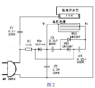 在图2 中,220V交流市电分两路进入灭蚊灯电路。其中一路经电容C1降压限流后加到紫外荧光管ZGG,使紫外荧光管得电发出紫外光,以引诱蚊虫飞入灭蚊灯。另外一路经限流电阻R1加到由整流二极管VD1、VD2、VD3 和电容C2、C3、C4等组成的3倍压整流电路,将220V交流市电转换为800~900V 的直流高压,其极性已示于图2 中(V- 和V+ 端)。直流高压加到用金属丝等距离平行编绕成的高压电网两端。当蚊虫碰到电网时,相邻两金属丝上的高电压通过蚊虫驱体放电,将蚊虫电击毙,当蚊虫刚接触电网时,由于虫体电阻的放电作用,高压电网的电压会明显下降,尤其是虫体电阻较小和同时有几个虫子触电网时更是如此。