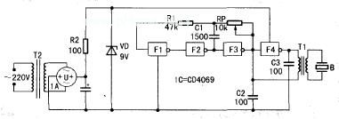 电路中超声波压电换能器B选用普通压电陶瓷片即可,T1为普通半导体收音机中的输入变压器。反向器F1~F4用CC4069六反向器中的四个反向器,剩余两个不用(输入端应接地)。T2可选用功率为5W的小型电源变压器。U为1A的桥式整流器,也可用四只1N4001代替。VD为9v稳压二极管。