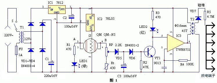 电路见图1。电路分为两部分,以QM-N5为中心元件的电路组成空气检测开关电路,它可以检测可燃气体。当室内的有害气体达到一定浓度时,由于B点电位升高使VT1饱和导通,起到了检测开关的作用。Rt为负温度系数热敏电阻,用来补偿QM-N5由于温度变化引起的偏差。以TWH8751为中心器件的电路组成负氧离子发生器,其振荡频率约为1KHz,在T2次级可得到5kV左右的高压。放电端采用开放式,大大提高了负氧离子的浓度,减小了臭氧的浓度,使到达外面的负氧离子增加,TWH8751的②脚即同相输入端为高电位时,振荡器停振,在正常室内环境下,A、B之间电阻很大,B点电位很低,VT1截止,TWH8751的 ②脚为高电位,振荡器不工作,没有负离子产生;当室内的有害气体浓度超过了RP设定的临界值,VT1饱和导通,TWH8751的②脚呈低电位,振荡器起振,产生负氧离子。在一定程度上负离子可以消除室内的烟雾,达到清新空气利于身体健康的目的。