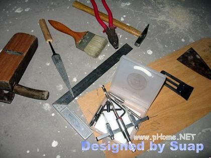 9、看看做箱所要的工具。木锉有更大的,图中这个小了,也就对付着用;锯子没有照进来,因为是用木工房的,用了两把锯,木板硬,锯横纹用齿细的,纵纹时则用粗齿的,业余没有这些条件,起码也得有一把大一点的侧手锯和一把两面锯;短刨要自备则要花些时间,新买的刨不能直接用,这时只能用鲁班学艺的精神,先收拾收拾工具;或许想想木工师傅怎么收拾工具,会让你事倍功半!图中还有两把油漆用的"灰刀",看出来了么?