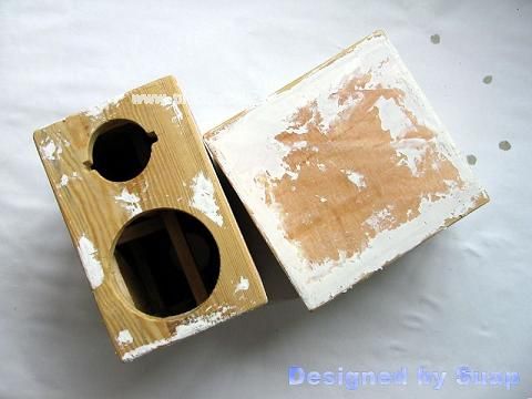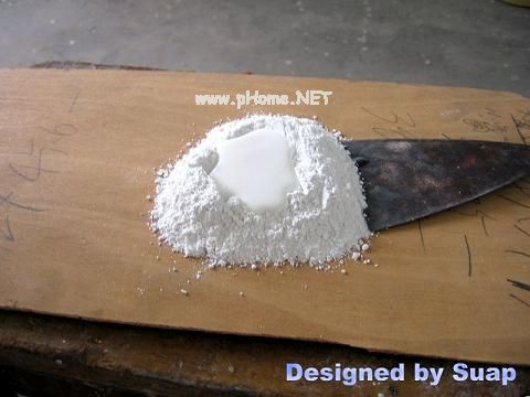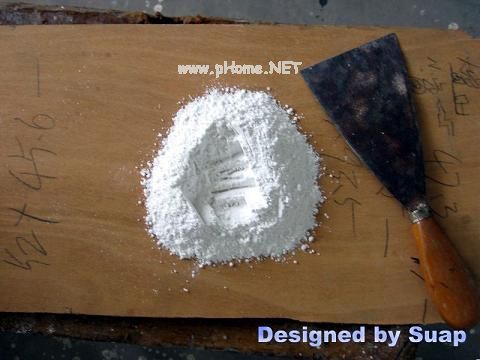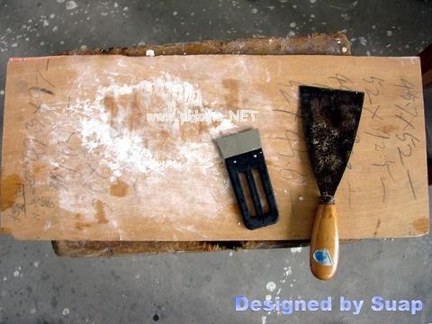 10、油漆。第一道工序是披灰。这一道工序可以分两步进行,第一步堵住钉眼等较大的孔,灰泥可以硬一些;第二步用灰刀 “披”上一层白灰!越薄越好。灰泥软一些,披灰易,但不要太软。如果大的洞眼不多也可合成一步。白灰可直接购买木油泥,5元左右/盒。自已调配:一种是用清漆+滑石粉——专业漆工,随用随调——业余不好控制;另一种是用白胶+滑石粉,具体调法用灰刀向一个方向边拉边挤,然后把灰泥聚拢,重复挤拉,不要用手直接触及灰泥,直至调匀。开始调前看上去很硬、干燥,调好后可能刚好,过程见图。如果太硬可以加点水——很少量,就是手浸一下,然后甩上去。能不用水就不用,一些家具店节省成本才多加水的,只做一对小箱子,一瓶白胶应该够用了(我只用了凌半瓶)。如果想懒一些,可以拿白胶刷一层,不建议这种做法,偷懒是要附出代价的,箱子表面将会很不平整!披灰除了平整,另外一个原因是直接刷油漆,木材吃漆深浅不一致,引起色泽不匀,如果你打算多用油漆刷好多好多遍,那也能解决问题——总能把木板表面盖个严严实实。要有两把灰刀,这样才能把粘在刀上的灰泥刷下来。
