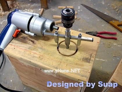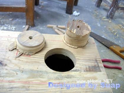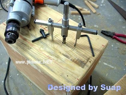 7、开孔器(续)。开孔外圆的刀刃略向外,内刃则略向内,这样能避免卡刀,用老虎钳夹住扭一下就行,别弯扭过了头。第二张图中左侧那一块是第一次开孔按照标注尺寸定位,结果砸了;右侧两个则是先画圆后开孔。这种开孔器刀头有钨钢,还不知如何完全使用它;还有一种开孔器的刀刃就两铁片按一定角度磨尖,专门用于开木头开孔,用来开密度板倒是不错。