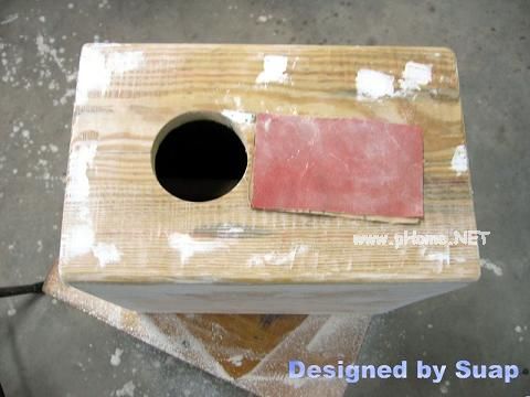 13、油漆前的最后准备。见下图,先打安装孔,钻头收进,别把扬声器、接线板的安装孔打穿。处理油漆用的刷子——打算用喷漆,此处跳过——用手拍打软毛处,并用砂纸磨光,最终使其少掉毛或不掉毛,质量好一些的刷子是需要的。图中是差的那种。