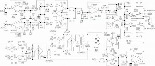 基于以上考虑,为了发挥已有的甲类功放的高音质,同时享受震撼的低音效果,笔者设计了这款D类低音功放。我们知道,D类放大器的效率很高,且频率越低失真越小,人耳对低频又不敏感,因而用D类。这款功放功率峰值可达350W,几乎可以不用散热器,用原来的书架式音箱再加一个无源低音炮,即可构成完整的音响系统。