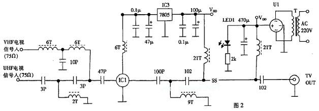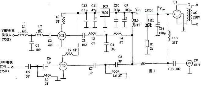 1.放大-混合方式的天线放大器的电路图如图1所示。1~12频道电视信号在VHF输入端输入,由L1、C1、L2组成一个简易低通滤波器,滤除12频道 以后的电视信号,送到IC1信号输入端进行约20dB的放大,被放大的电视信号经电容C3输出,通过L3、C4、L4低通滤波器与UHF信号相混合后输送 到电视信号输出端。另一路UHF输入端输入的13~57频道电视信号,由C5、L5、C6组成简易高通滤波器,只允许UHF频段的13频道及以后频道的信 号通过,再加到IC2信号输入端进行约20dB的放大,输出后通过高通滤波器(C7、L6、C8)与VHF电视信号相混合后送TV OUT端。该电路的电源由变压器T降压、U1整流、C14滤波、IC3稳压后供给放大器。LED1、R1为电源指示电路。