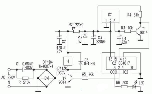 图中IC1为彩电遥控接收头,1脚为地,2脚为+5V电源端,3脚为信号输出端,未接收到信号时为+3.6V左右,接收到信号时为0V左右,IC2为CD4017十进制计数/译码集成电路。