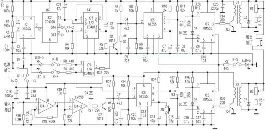 IC7、IC8及其相关元件构成两个占空比可调多谐振荡器,这两只振荡器的起振受IC5{3}脚的输出电压控制。当IC5进入暂稳态期间,其{3}脚输出的高电平一方面经电阻R5使LED-S发光,指示IC5已进入暂稳态;一方面分别加到IC7和IC8的{4}脚,使IC7和IC8起振。振荡输出由各自的{3}脚取出,经R14和R30分别激励Q3和Q4,并在B1和B2的原边绕组形成脉冲电压,该电压经升压后加到输出插口,形成复合电脉冲。W1和W2为调整电位器,改变其值可调整输出电脉冲的幅度。