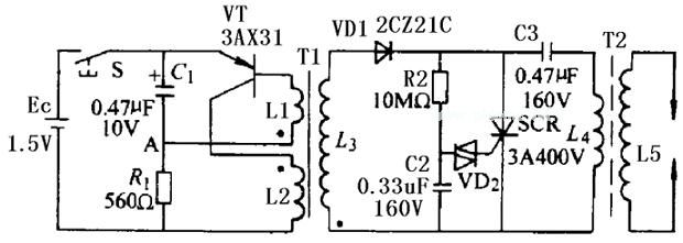 电源接通时,通过R1给VT提供一个基极电流,因此VT的集电极电流开始增加,通过L1、L2的耦合作用,在L1产生感应电动势,此电动势与电源电压叠加,使基极电流进一步增加,集电极电流也更趋增加,形成强烈的正反馈,结果使VT很快进入饱和状态,这时VT的集电极电流不再增加,因而L1中感应电动势将减小,VT的基极电流也开始减小,VT开始退出饱和区。集电极电流开始下降,在L1中的感应电动势极性变化,使基极电流进一步减小,如此又形成一个正反馈过程,结果使VT很快进人截止状态。在L1中感应电动势极性改变的同时,VD1开始导通,L2的能量传递给L3,待L2中磁能消耗完毕,VT的基极电位又下降,使VT再次导通,进人一个新的振荡周期。二极管VD1和C3、L4组成高压整流储能电路。根据T1各绕组的接法,L2处于电流增加阶段时,L3中的感应电动势的方向使VD1不能导通,只有当L2中电流从最大值开始减小时,L3的感应电势使VD1导通,并通过L4向C3充电,同时还通过R2向C2充电。在C2的电压还没有充到触发管VD2的导通电压(约30V左右)以前,C3没有放电回路,电压越来越高。R2、C2、VD2、SCR、C3、L4、L5组成充放电回路及打火回路。当C2的电压充到触发二极管VD2的导通电压时,VD2被击穿,电容C2通过VD2向晶闸管的触发极放电,使晶闸管SCR导通,把C3储存的能量迅速放掉,在L5感应出万伏以上的脉冲电压,击穿放电电极的间隙,产生放电火花。