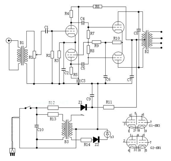 这里介绍一种微型胆机,给小电视或小收音机或小CD做放大,而且电耗小,又有胆机味。采用6N3做自动平衡倒相放大,6N1做甲乙类功放,可获得不失真功率1W,推动高灵敏度小音箱,有较好的音色,尤其是听人声—女生歌唱,比大胆机更有一番清丽的感觉。