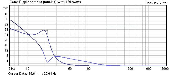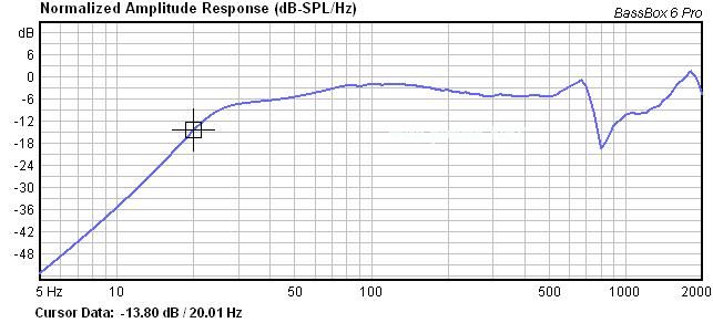 显然这个曲线已经比上一页中采用封闭式音箱时的频率响应曲线好了不少。曲线显示导向孔音箱可以提供更低的频率输出,但是美中不足的是,该曲线在20Hz点左右开始发生急剧变化,而这会很大程度上影响到20Hz时的声压级和振幅,而此时导向孔的直径已经达到了72mm,这足以使噪音有可乘之机。结果就是,即便是非常小的噪声,也会影响到最终的放音效果。