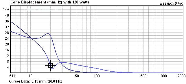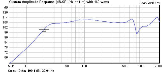 在上面的图中我们可以看到,在20Hz达到100dB声压级的目标已经基本上实现了,纸盆的振幅控制在12.5mm以内而空气的最大运动速度为34.1- m/s。同时非常值得注意的是,此次我们的放大器只消耗了160瓦的功率,而在封闭型音箱中,XLS10消耗的功率几乎是这里的两倍。当然同样也有一些缺点,首先导向孔的长度需要不少于607mm,这也就意味着我们必须将其弯曲才能装进容积有限的外壳之内。另外,这种方案已经接近了在导向孔音箱中扬声器振幅和空气运动速度的极限。那么无源辐射器箱体又能够带来哪些更好的特性呢?