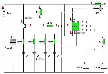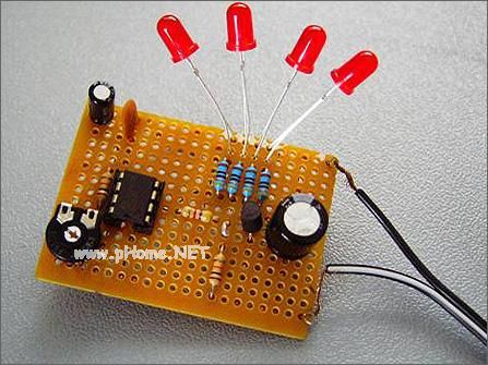 检查完成后就可以通电看看效果了!如果焊接无误,通电之后就能工作的。通过可调电位器来调节闪灯的频率。当然,这里只是示范!你可以把LED灯换成红色以外的任何颜色,也可以做多个灯光控制板控制多组LED来达到更炫的效果。