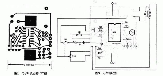 图1是电子针灸器的电路原理图。电路的电源为9V电池B1。开关S1用来接通和断开电子针灸器用,它在结构上与电位器R10是联动的。电阻R1用来限制电路的耗电。
